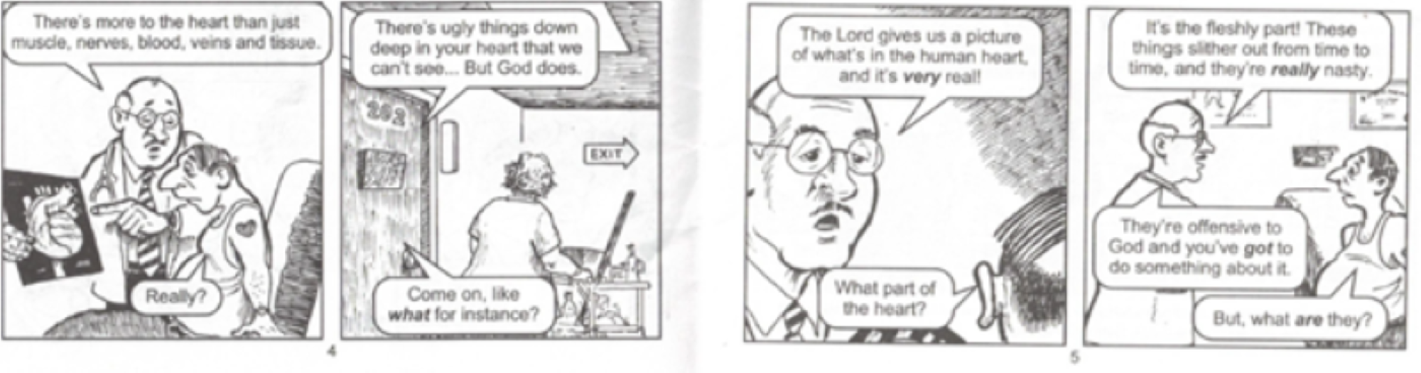 I have qualified my language with the word “like”—"like an ugly cancer,” “biological-like” and “like a sin gene.” The reality, however, is that many Christians do think of sin as passed on from generation to generation in a very physical way—as seen in this tract’s portrayal of sin. On the previous page, the doctor had said “Everybody’s born with a bad heart problem.”